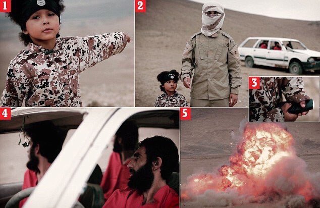 Als der Junge den Fernzünder drückt, fliegt ein Auto in die Luft, in dem mindestens drei Gefangene des IS sitzen. Es handelt sich angeblich um Spione aus Großbritannien, die von der Terrormiliz festgenommen worden waren. Nach der Sprengung ruft der Vierjährige „Allahu Akbar“ („Gott ist groß“) und streckt einen Arm triumphierend in die Luft. Das Video hat in vielen internationalen Medien für Aufruhr gesorgt. Es soll eine Warnung an den britischen Premier David Cameron sein.
